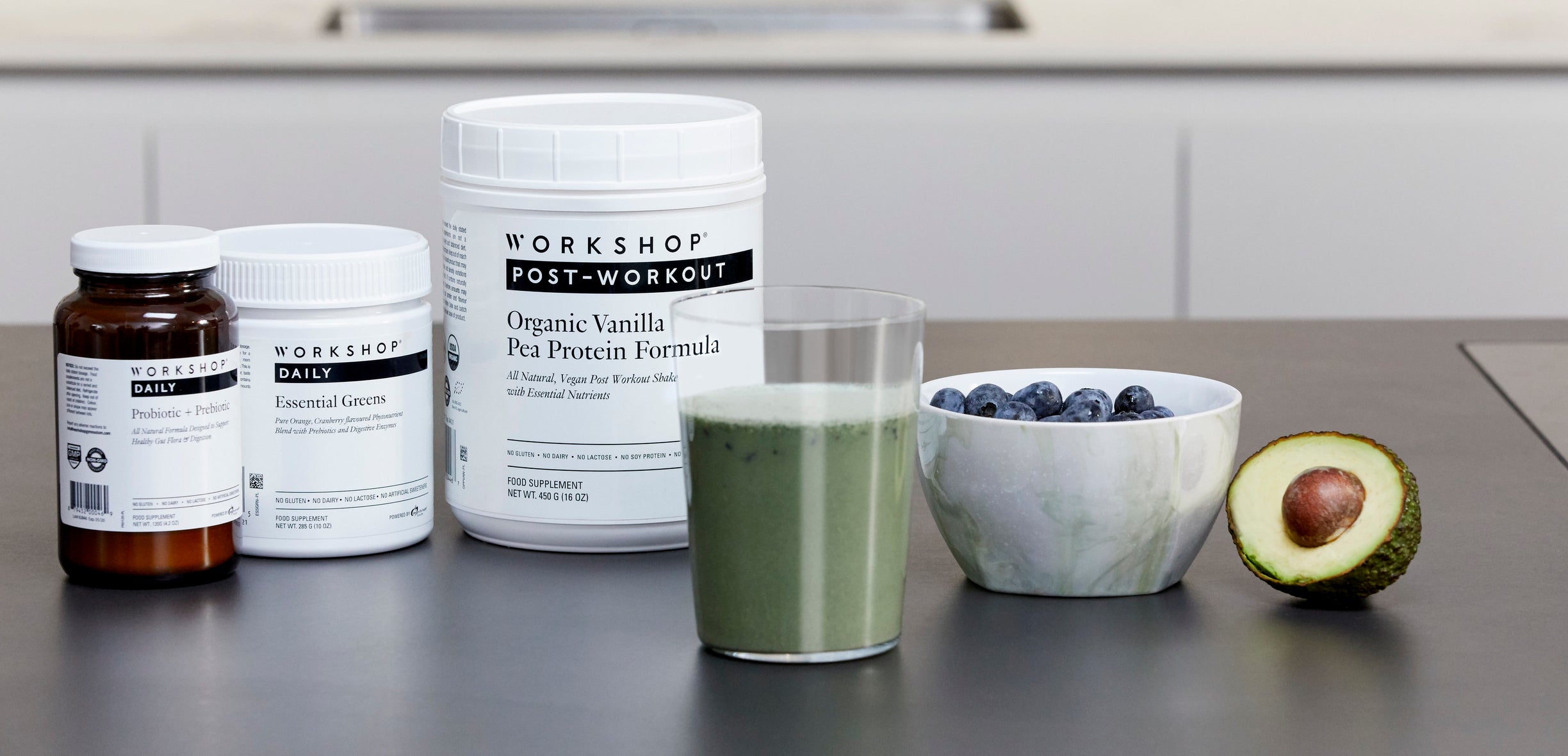 Loaded with protein and plenty of skin-strengthening antioxidants from Workshop’s Essential Greens and blueberries, this smoothie will help your skin glow from the inside out, as well as boost nail and hair health. Rich in omega-9, minerals and vitamins, including vitamins C and E, avocado helps reduce inflammation and boost collagen production for a plumper complexion, while the addition of Workshop’s Probiotic + Prebiotic aids digestion and gut health, leading to healthier, brighter skin.